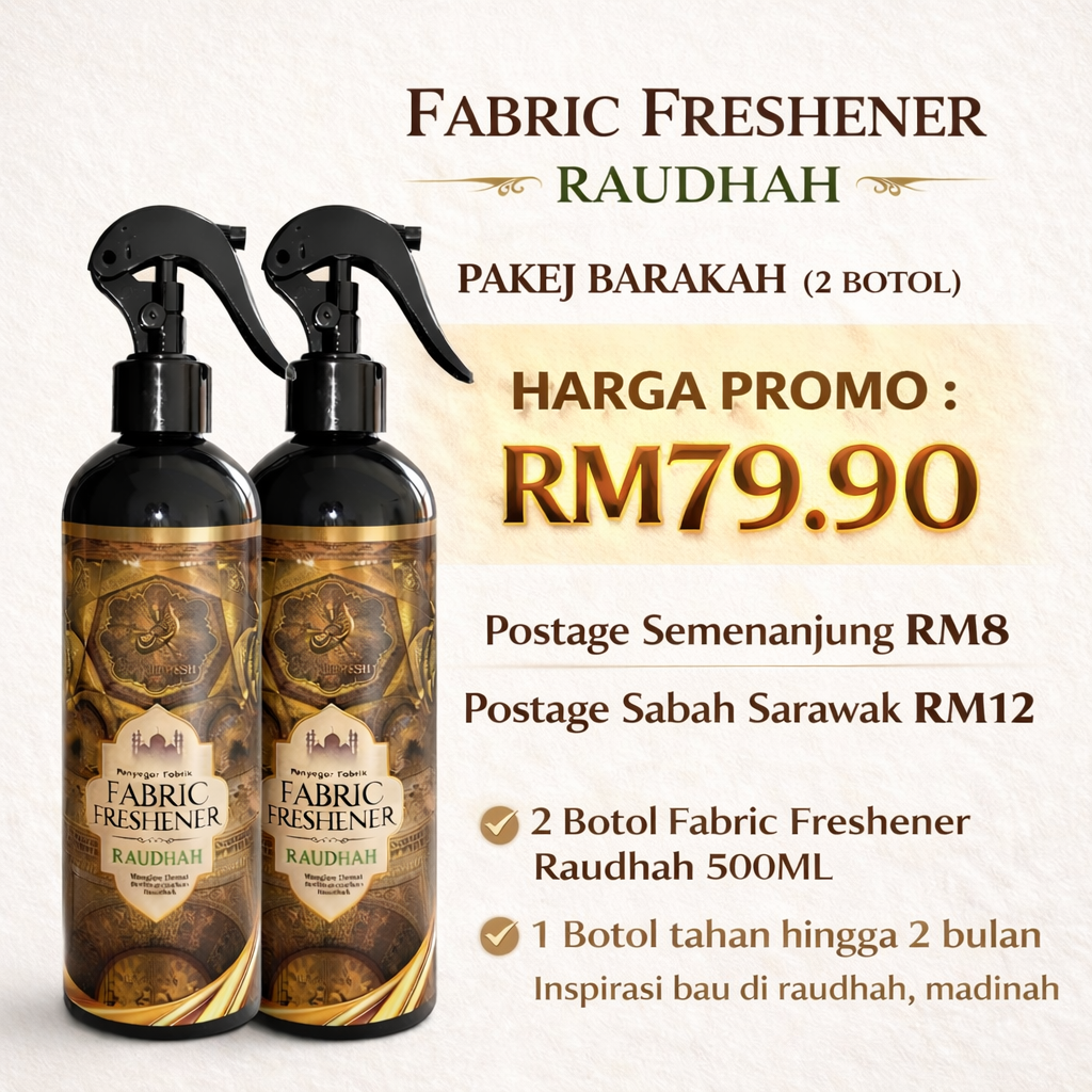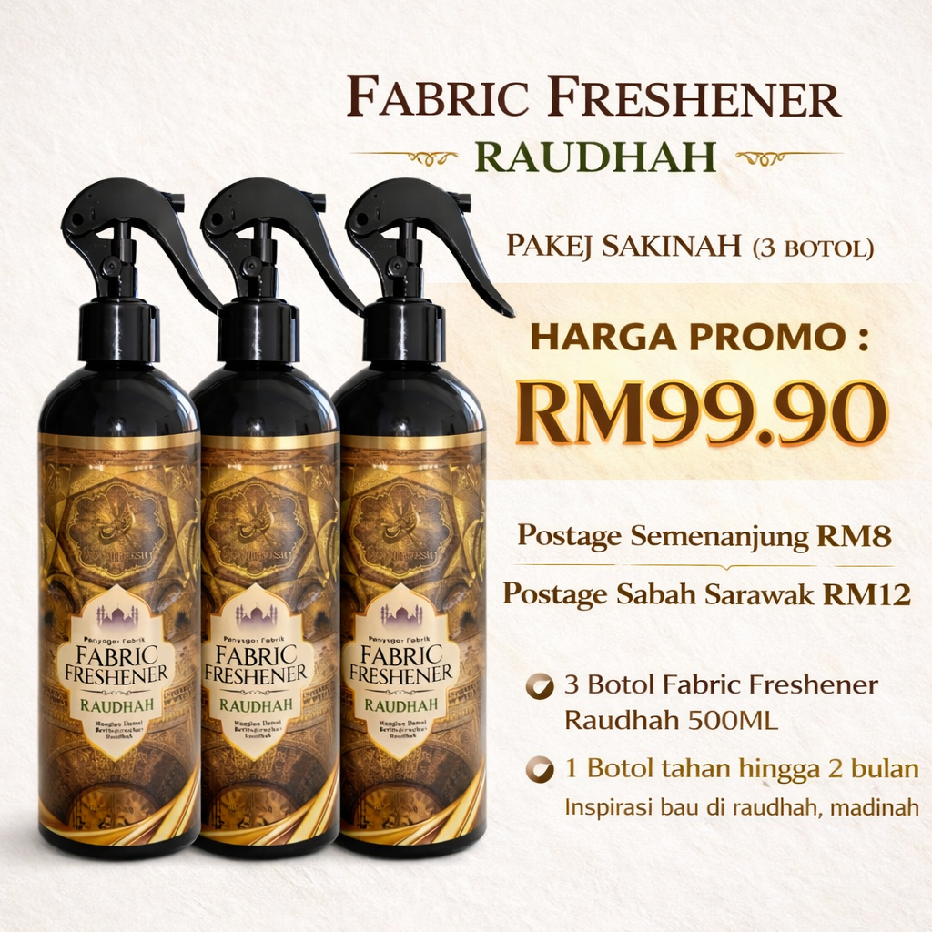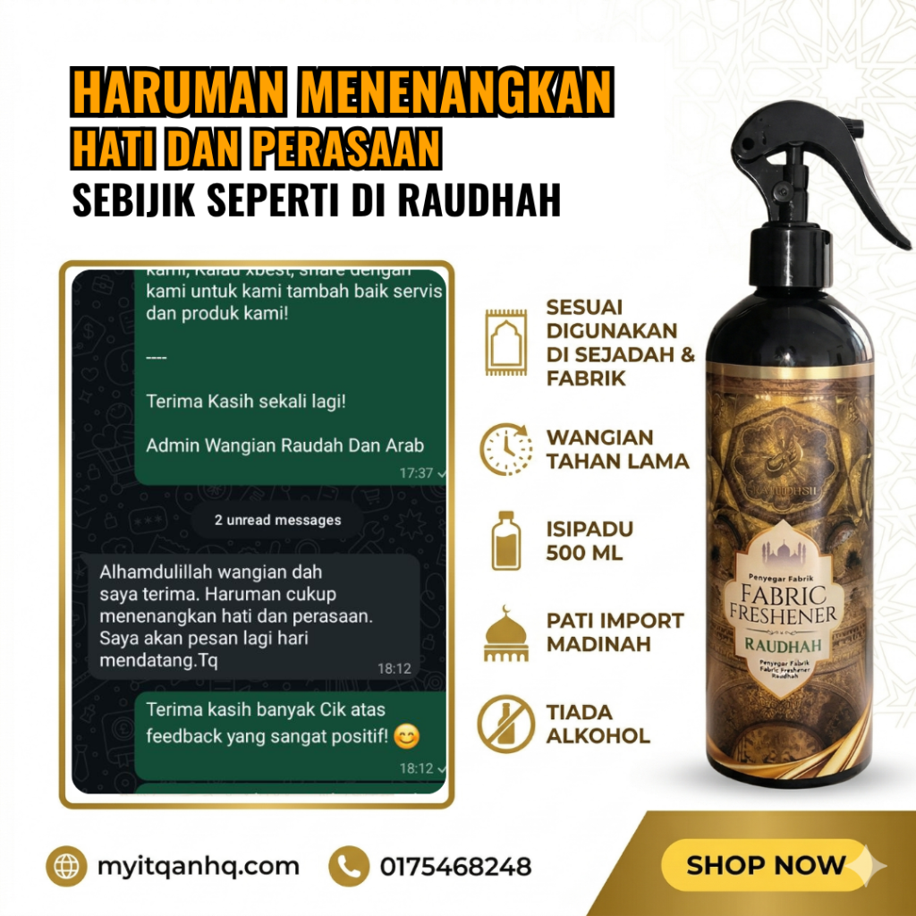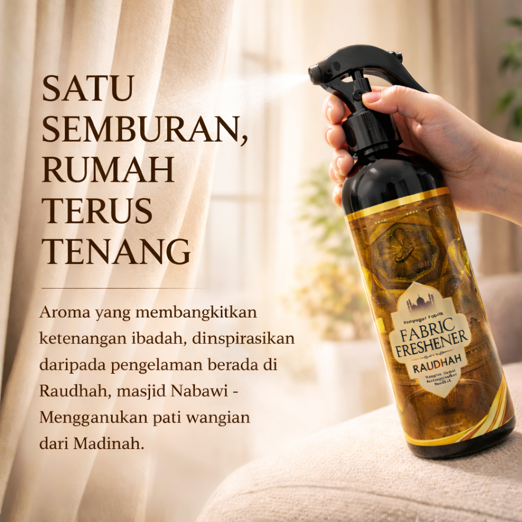 Wangian Raudhah - haruman suci dengan inspirasi haruman Raudhah Masjid Nabawi, Kini hadir dalam bentuk Fabric Freshener. Dihasilkan dari pati asli madinah dengan haruman mirip 99% seperti haruman raudhah, haruman yang lembut, segar dan menenangkan jiwa. Sesuai digunakan untuk bersolat, sesuai untuk kegunaan di rumah , pejabat atau dijadikan hadiah buat insan tersayang.