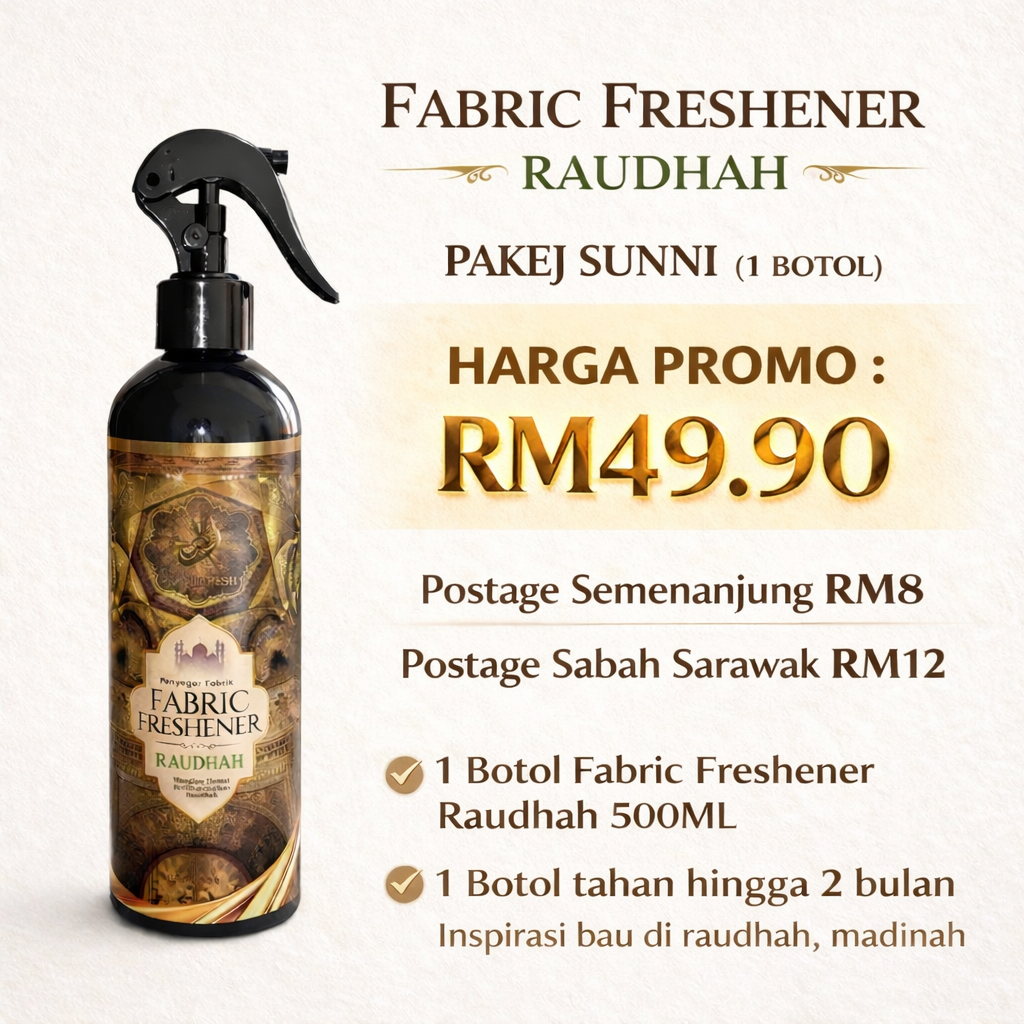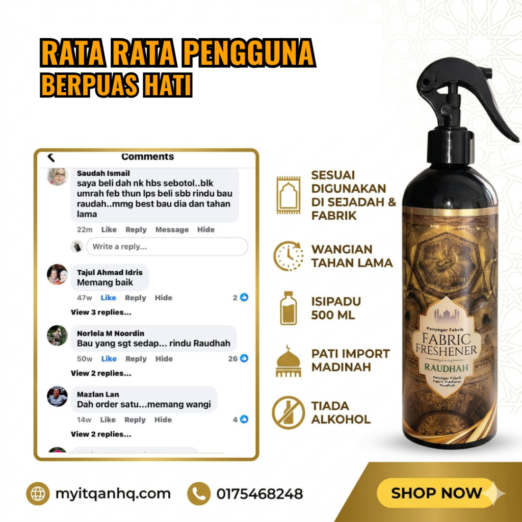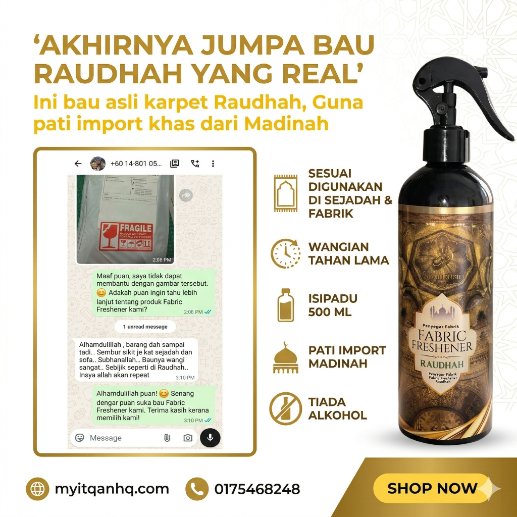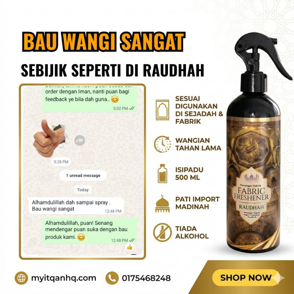 Wangian Raudhah - haruman suci dengan inspirasi haruman Raudhah Masjid Nabawi, Kini hadir dalam bentuk Fabric Freshener. Dihasilkan dari pati asli madinah dengan haruman mirip 99% seperti haruman raudhah, haruman yang lembut, segar dan menenangkan jiwa. Sesuai digunakan untuk bersolat, sesuai untuk kegunaan di rumah , pejabat atau dijadikan hadiah buat insan tersayang.