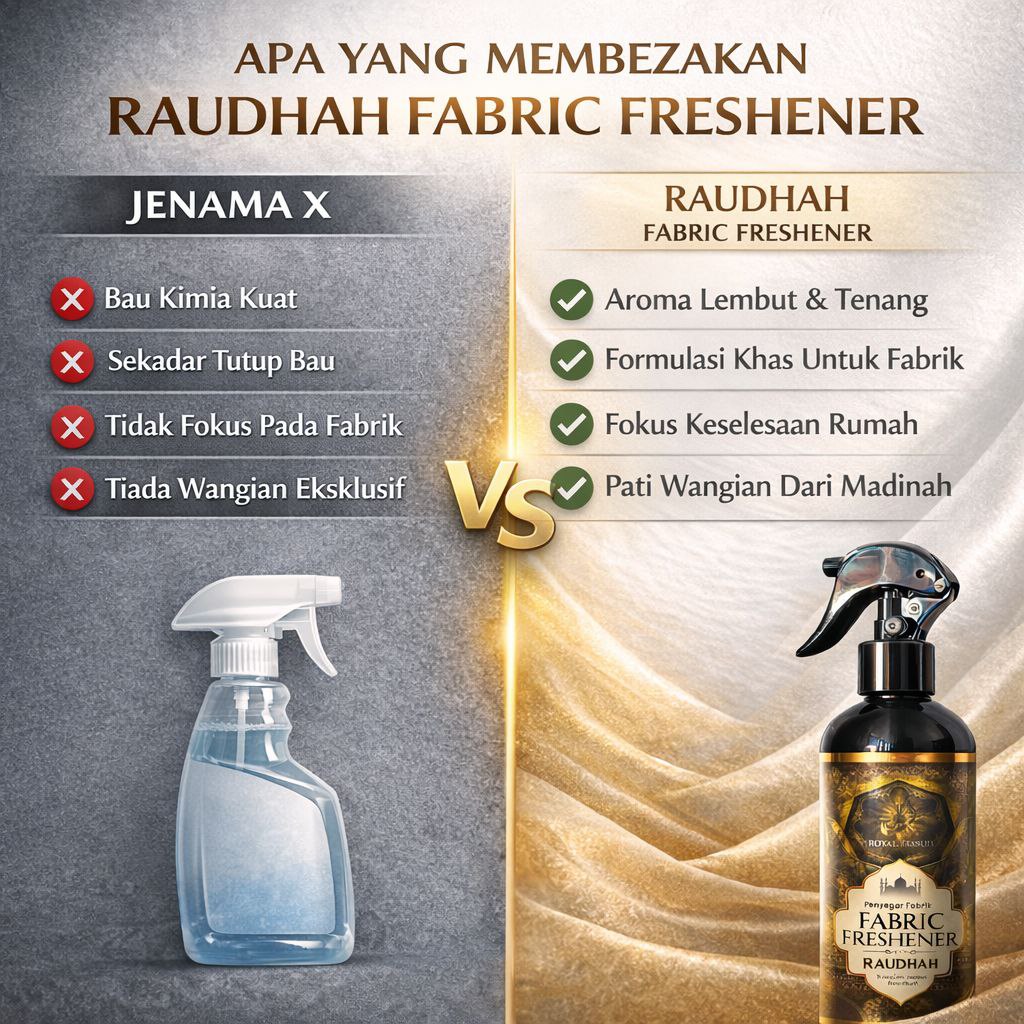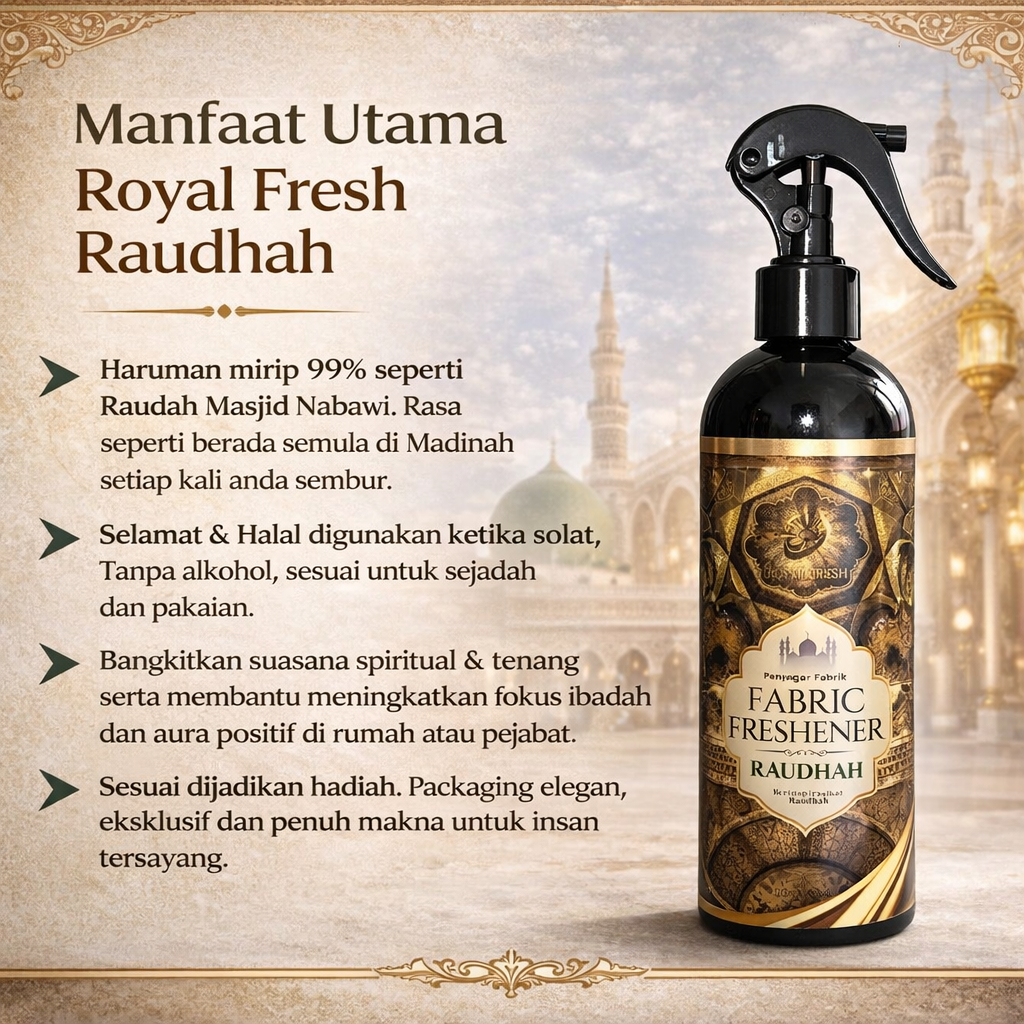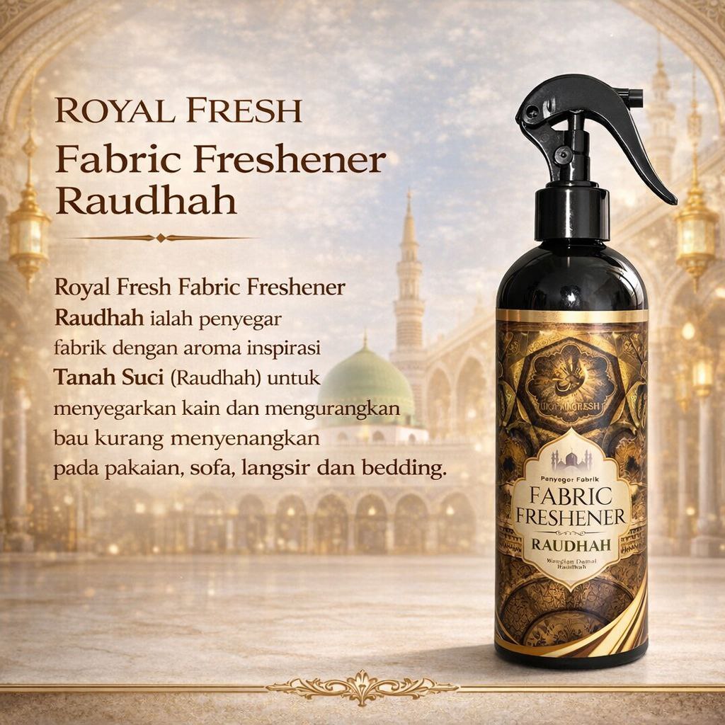 Royal Fresh : Raudhah Fabric Freshener ialah penyegar fabrik dengan aroma yang dipilih berdasarkan aroma di raudhah , masjid nabawi. Direka khas untuk kegunaan harian bagi membantu menyegarkan fabrik dan ruang tanpa bau yang menyengat serta mengembalikan nostalgia berada di tanah suci mekah & madinah.